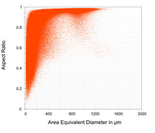 However, this representation does not show for which particle sizes certain Aspect Ratio values may occur preferentially, e.g. whether large particles tend to deviate from the perfect spherical shape more than smaller ones. This is where displaying the data in a 2D or even 3D Cloud is helpful. As an example, Figure 4 shows the same measurement as a 2D Cloud. Each measured particle generates a data point where the y value gives the Aspect Ratio and for x value the Area Equivalent Diameter is chosen. Of course, any other size (or even shape) parameter can also be used for the x axis.