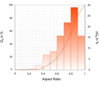 When displaying the shape parameters of an examined material sample, two different options are now available in the ImageSizing-Software ISS: For a selected shape parameter, e.g. the Aspect Ratio (width-to-length), a distribution analogous to a particle size distribution can be generated - instead of a particle size, the Aspect Ratio is plotted on the x-axis. The y-axis then represents either the relative fraction of particles with an Aspect Ratio smaller than the x-axis value (solid line in Figure 3, left y-axis) or the fraction within a certain Aspect Ratio interval (shown as a bar in Figure 3, right y-axis). This provides a quick, compact overview with respect to the selected shape parameter.