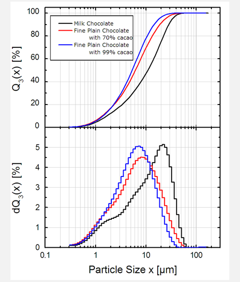 Significant differences are visible: the chocolate with a large fraction of cocoa does have a much finer particle size distribution than e.g. milk chocolate. This leads to a very smooth and sometimes even sticky sensation what in turn yields a very intensive taste. Higher content of sugar as in milk chocolate typically results in a particle size distributions that is shifted toward larger particles.