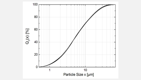 During the measurement of particle size distributions, reproducibility is of major interest. Picture 2 shows the cumulative curve distributions Q3(x) of 5 consecutive measurements of a sample taken from the production process of milk chocolate in order to control the conching process. About 5 g of chocolate were added to a beaker glass and were pre-dispersed in an organic solvent using an external ultrasonic bath. From this beaker glass for each of the ten measurements now a small amount of sample material was added to the small volume wet dispersion unit of the ANALYSETTE 22. After each measurement the dispersion unit was flushed and the system was refilled with solvent for the next measurement.