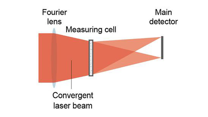 In order to measure the size of a particle, a laser beam is directed at it. The partial deflection of the laser light results in a characteristic, ring-shaped intensity distribution behind the sample, which is measured with a specially shaped detector. The particle size is calculated with a suitable scattering theory based on the spacing of these rings. Large particles produce closely situated rings small particles produce more widely spaced rings. Since 30 years FRITSCH has been building Laser Particle Sizers with a special patented optical set up. A convergent laser beam shines through the measuring cell, and its distance from the detector can be adjusted depending on the sample material. Is it spaced far from the detector the only slightly scattered light waves cover the entire detector and use all the channels for the measurement. Large particles are measured perfectly in this manner. Is the measuring cell positioned close to the detector, the heavily scattered light beams of the small particles are measured with the full resolution of the detector.