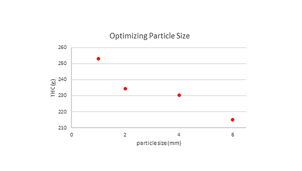 After testing (Figure 1), we chose the 2 mm screen size, as it allows for a high packing density, increased extraction speed, optimized oil constitution, while allowing the operator to constantly feed material into the mill itself, thus increasing work efficiency. The blade speed of 300 rpm was found to be optimal for narrow particle size distribution. Furthermore, this low blade speed avoids thermal damage and loss of volatiles for the sample. It is important that the moisture content of the material being milled is dry, below 15%, as the milling sieve will clog in the presence of moisture. One full extraction load of 4.5 kg can be milled before stopping the machine to clean the sieve and behind the milling wheel to prevent buildup of chlorophyll and cannabis residue. If there is not enough of a single cultivar to facilitate a full extraction run, a blend of strains can be homogenized using the FRITSCH mill. Strains selected for a blend should have complimentary flavor profiles and can also be chosen to enhance therapeutic effects.