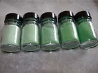 A pigment which is being comminuted has an altered colour, in contrast to the primary particle. This is due to the fact, that crystals because of their size, influence the transparency. The primary particle is therefore responsible of how we optically perceive it. Shown in the photo on the right, the intensity decreases towards the left – to the finer particles; therefore the finest share seems to be the lightest. The shares are: < 63 µm, 63 – 80 µm, 80 – 100 µm, 100 – 125 µm, 125 – 200 µm.