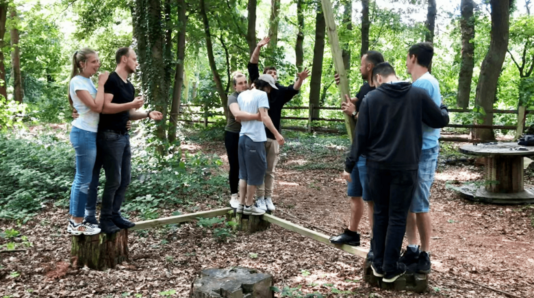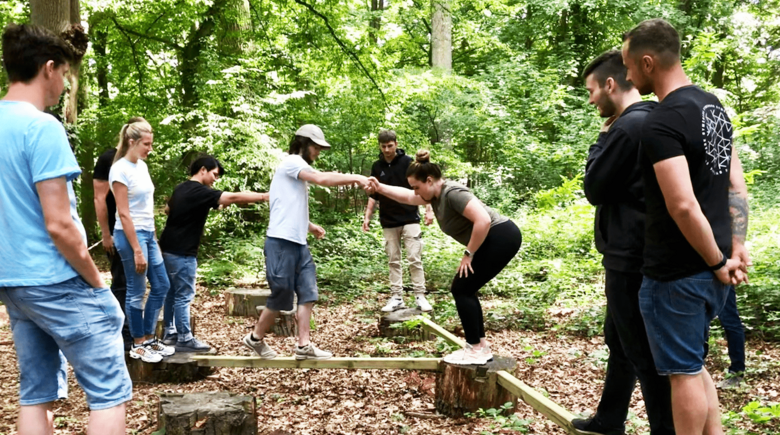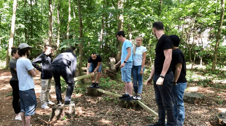 Dort angekommen mussten wir feststellen, dass es jede Menge zu entdecken gibt. Unter anderem ein angrenzender Wald gefüllt mit diversen Anlagen für Übungen zum Teambuilding. Die Zimmer wurden besiedelt und schon kurz darauf begann das Seminar der Wicke Akademie. Unser Seminarleiter Herr Linke, lockerte schon in wenigen Minuten die angespannte Stimmung, da sich aufgrund der getrennten Abteilungen und Gebäuden manche Azubis kaum kannten. Der Montag war gefüllt mit abwechslungsreichen Teamspielen im Wald. Die erste Übung „Wippe“ brach das Eis und wir kamen uns alle wortwörtlich näher. Das Besondere an diesen Übungen war der Aufbau. Jede Übung hatte eine Phase zum planen, in der sich jeder zu Wort melden konnte und Ideen äußern konnte. Danach begann die „Durchführ Phase“, in der die Übung mit einem Zeitlimit durchgeführt wurde und zuletzt gab es dann immer eine Besprechung bzw. Rückmelderunde über positive, aber auch negative Dinge. Es folgten noch weitere Übungen, welche oft sehr gut gelaufen sind, aber auch welche, in denen wir z.B. das Zeitlimit überschritten haben. Aber wir haben stets weitergemacht bis alle Azubis das Ziel der Übung erreicht haben. Auch gab es Übungen, welche mit einer Augenbinde durchgeführt wurden, diese forderten extremes Vertrauen in den jeweiligen Kollegen, da man nur zusammen das Ziel erreichen konnte.