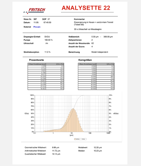 Das unten gezeigte Beispiel für eine Partikelgrößenverteilung an Ampicillin, einem halbsynthetischen Antibiotikum aus der Gruppe der β-Lactam-Antibiotika (Penicilline), wurden jeweils unter Verwendung einer Kleinmengen-Dispergiereinheit in Hexan gemessen, da sich das Probenmaterial in Wasser und auch anderen Lösungsmitteln auflöst. Vor der eigentlichen Messung wurde eine extern angesetzte Suspension jeweils 30 Sekunden lang in einem Ultraschallbad vordispergiert.