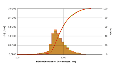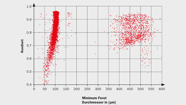 Ein wesentlicher Vorteil der Dynamischen Bildanalyse liegt natürlich in der Möglichkeit, neben der reinen Bestimmung des Durchmessers auch Informationen zur Geometrie der Partikel zu erhalten. Als einer der einfachsten Formparameter sei hier das Aspektverhältnis genannt, das sich als Quotient aus minimalem zu maximalem Feret-Durchmesser ergibt.