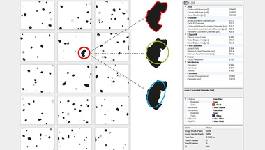 Was fängt man nun mit all den aufgenommenen Bildern an? Zunächst lässt sich natürlich die Partikelgröße bestimmen. Allerdings hat man hier dann schon die Qual der Wahl: Denn während beispielsweise bei der Statischen Lichtstreuung nur ein Wert für den Partikeldurchmesser angegeben wird, bietet ein abbildendes Verfahren natürlich unterschiedliche Möglichkeiten, den Durchmesser eines meist unregelmäßig geformten Partikels zu definieren. Beispiele hierfür können sein der flächenäquivalente Durchmesser (das ist der Durchmesser einer Kugel, deren Querschnitt die gleiche Fläche aufweist wie das ausgewertete Teilchen), der aus dem Teilchenumfang berechnete Durchmesser oder der sogenannte Feret-Durchmesser, bei dem zwei parallel Geraden an gegenüberliegende Seiten eines Partikels so angelegt werden, dass sie jeweils das Teilchen berühren aber an keiner Stelle der Partikelrand durchkreuzen.