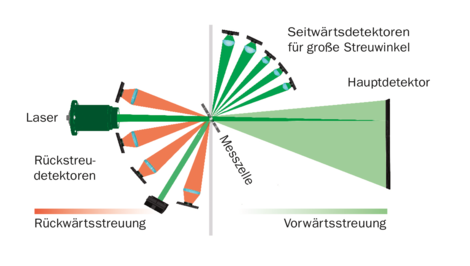 Für die Erfassung von Partikeln mit einem Durchmesser von weniger als 100 nm ist die Messung des rückwärts gestreuten Lichtes (Streuwinkel größer 90°) notwendig. Dies erfolgt bei der ANALYSETTE 22 NeXT Nano durch dafür speziell nahe der Messzelle platzierte Detektoren. Als Lichtquelle dient der Laser, dessen grünes Licht gleichzeitig auch für die Vermessung der Vorwärts- und Seitwärtsstreuung verwendet wird. Bei dem Design der Rückstreudetektoren wurde besonderes Augenmerk auf die Unterdrückung unerwünschter Signalanteile gelegt, die beispielsweise durch Reflexion an den Messzellengläsern entstehen.