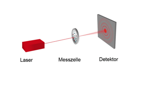 Durch die teilweise Ablenkung des Laserlichtes entsteht hinter der Probe eine charakteristische, ringförmige Intensitätsverteilung, die von einem speziell geformten Detektor vermessen wird. Aus dem Abstand dieser Ringe wird die Partikelgröße berechnet: Große Partikel erzeugen eng benachbarte Ringe, kleine Partikel weiter auseinanderliegende. Das ist das Prinzip.