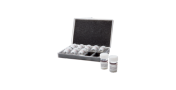 Box mit FRITSCH-Prüfpulver F-500 für 0,5 - 50 μm (50 g), 3 Einzelproben Prüfpulver 10 - 100 μm (0,5 g), 3 Einzelproben Prüfsuspension nano (ca. 200 nm) zum System-Check (5 ml), 3 Einzelproben Prüfsuspension 1 μm zum System-Check (5 ml), 3 Einzelproben Prüfsuspension 1 μm zum System-Check (5 ml), 3 Einzelproben Prüfsuspension 10 μm zum System-Check (5 ml).