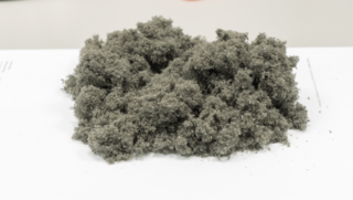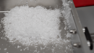 Der zweite Versuch dokumentiert die Zerkleinerung von FFP2 Schutzmasken. Metallteile die sich an den Masken befanden mussten vor dem Zerkleinerungsprozess entfernt werden. Die PULVERISETTE 19 war mit dem Standardrotor mit V-Schneiden, sowie einer Siebkassette 4 mm Quadratloch ausgerüstet. Die Mahldauer betrug 45 Sekunden.