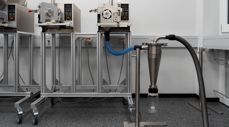 Die PULVERISETTE 19 wurde mit dem Standardrotor mit V-Schneiden aus gehärtetem rostfreiem Stahl, sowie einer Siebkassette mit 2 mm Quadratloch ausgerüstet. Um einen besseren Durchsatz zu erzielen, wurde der Hochleistungszyklon aus Edelstahl angeschlossen. Die Textilmuster wurden in weniger als einer Minute zerkleinert. Für die größeren Textilteile (Rock und T-Shirt) wurde etwa 2 Minuten benötigt, für einen Ertrag von 105 Gramm Mahlgut. Es ist zu beachten, dass das Volumen des Mahlgutes ca. 30% höher ist, als des ursprünglichen Probenmusters, aufgrund der Strukturveränderung der Partikel. Der Rückstand in der Mahlkammer betrug 5 – 10 % Probenmaterial