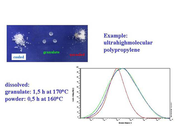 Hierbei handelt es sich um eine Art der Flüssigchromatographie ähnlich der HPLC. Die Trennung findet hier aufgrund der Größe der Moleküle in der Lösung statt. Je nach Detektor werden Molmassenmittelwerte, Polydispersität und Viskosität der Polymerprobe ermittelt. Wichtig hierzu ist die geeignete Probenvorbereitung um die Polymere zu lösen. Degradation, d.h. die Zerstörung von Materialeigenschaften des Polymers muss dabei vermieden werden. Eine ideale Lösung zur Probenvorbereitung stellt die Rotor-Schnellmühle PULVERISETTE 14 classic line dar. Hiermit lassen sich Endfeinheiten bis < 80 µm erreichen. Eine Versprödung des Polymers mit flüssigem Stickstoff oder das Vermahlen unter Zugabe von Trockeneis vermeidet die Degradation. Nachfolgende Grafiken zeigen die Analyse von PE (Polyethylen) und PP (Polypropylen).