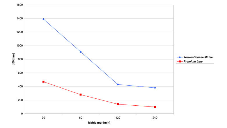 Der d50 Wert des Ausgangsmateriales beträgt 21 µm. Bereits nach 60 Minuten liegt der d50-Wert der Partikelgrößenverteilung gemahlen mit der FRITSCH premium line unter 300 nm. Dieser Wert wird mit der konventionellen Planetenmühle auch nach 240 Minuten noch nicht erreicht. Am Ende dieser Versuchsreihe (240 Minuten) wurde mit der neuen premium line ein d50-Wert der Partikelgrößenverteilung von 99 nm erreicht. Um noch kleinere Partikel zu erzeugen, empfehlen wir in einem nächsten Schritt noch kleinere Mahlkugeln zu verwenden.