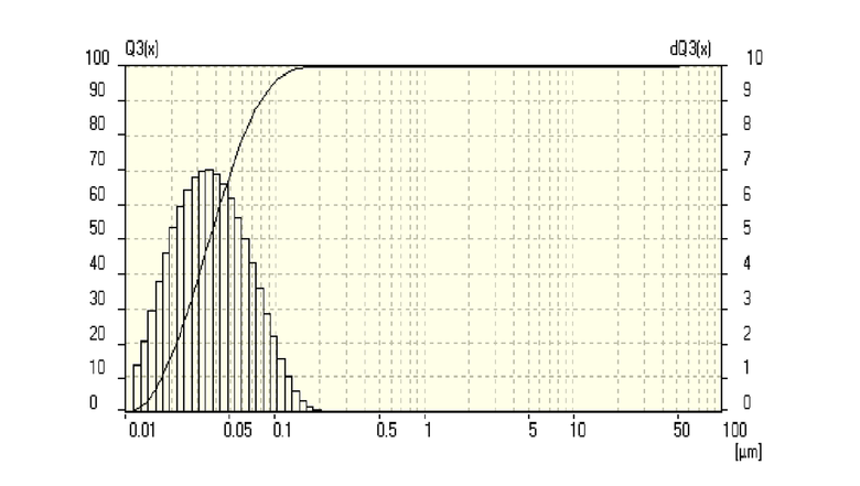 Die dargestellte Korngrößenverteilung wurde mit dem FRITSCH Laser-Partikelmessgerät ANALYSETTE 22 unter Berücksichtigung der entsprechenden Mie-Parameter gemessen. Bei einer Vermahlung in einer Kugelmühle lässt sich ein gewisser Abrieb an den Mahlkörpern nicht vermeiden. Dieser auftretende Abrieb wurde in oben gezeigter Messung vom Original abgezogen.