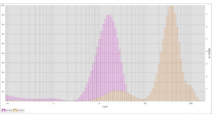 Abb. 3: Die ANALYSETTE 22 wurde zur Messung des CBD-Isolats vor und nach der Homogenisierung verwendet. Die Ausgangs-CBD-Probe (orange) enthielt eine Mischung aus losen Körnern mit einer breiten Partikelgrößenverteilung.