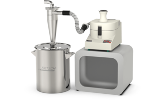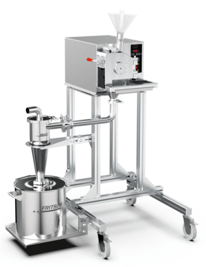 Abb. 2: Links das Schneidmühlensystem PULVERISETTE 19, mit Hochleistungs-Zyklon, der auf einem 60-Liter-Auffanggefäß montiert ist.