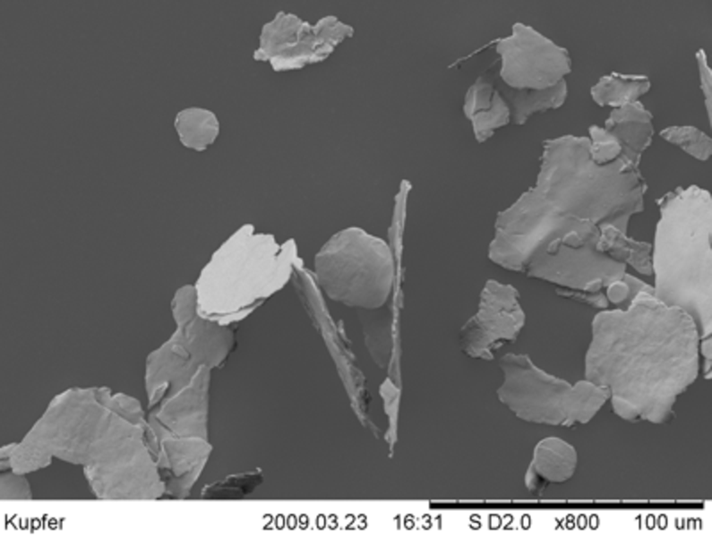 Sehr schön ist dies auf den folgenden Aufnahmen zu erkennen, die mit einem Elektronenmikroskop aufgenommen wurden. Bei einer Plättchendicke von ~2 µm beträgt die Abmessung in Längs- bzw. Querrichtung etwa 20 - 40 µm.