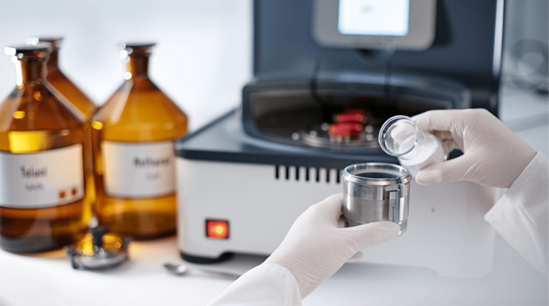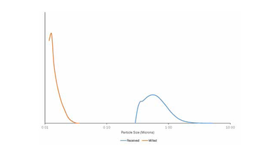 Wir haben verschiedene Mühlen und Prozesse geprüft und getestet unter anderem auch Kugelmühlen und Vibrations-Mühlen. Obwohl diese Techniken helfen die D50 Partikelgröße zu reduzieren und auch die Partikelgrößenverteilung verbessern, sind die produzierten Pulver immer noch von unzureichender Qualität für unsere anspruchsvolle Forschungsarbeit. Seit ein paar Jahren arbeiten wir mit den FRITSCH-Mikromühlen um viel kleinere und gleichmäßigere Partikel zu entwickeln, weil diese Mikromühlen in der Lage sind ultrafeine Mahlergebnisse bis in den Nanobereich zu erzielen (Abb.1). Die Mühlen im Labormaßstab nutzen kleinere, sehr harte Mahlkörper und setzen außergewöhnlich hohe Mahlenergie frei.