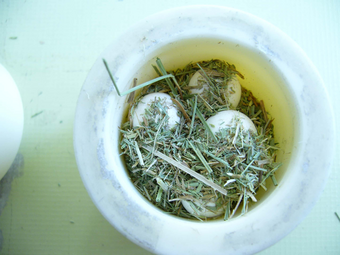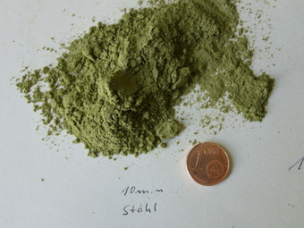 In weiteren Versuchen mit der Planeten-Mikromühle PULVERISETTE 7 classic line wurde vorzerkleinertes Material aufgegeben und die Mahlgarnitur aus Stahl genutzt. Nach 10 Minuten war - wie hier im Bild gezeigt - das Gras zu Pulver aufbereitet. Wird von dieser Probe 20 mg eingewogen ist mit Sicherheit davon auszugehen, dass eine repräsentative Probe dem Messgerät zugeführt wird.