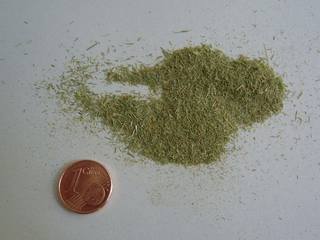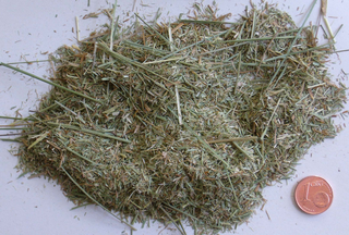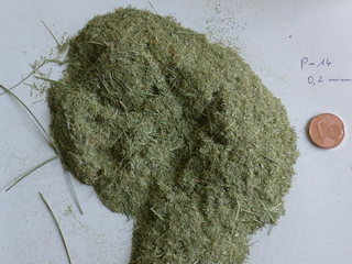 Für Mahlversuche wurde vom Kunden getrocknetes vorzerkleinertes Gras bereitgestellt. Deutlich sind die Namensgebenden harten Halme zu sehen. Als Aufgabenstellung wurde formuliert, dass das Material kleiner 0,2 mm sein soll. Als Gerät hatte sich der Interessent die Rotor-Schnellmühle PULVERISETTE 14 classic line ausgesucht. Diesem Wunsch folgend wurde die Mühle mit einem 0,2 mm Sieb bestückt. Das Ergebnis ist unbefriedigend. Einige Halme blieben in voller Länge erhalten.