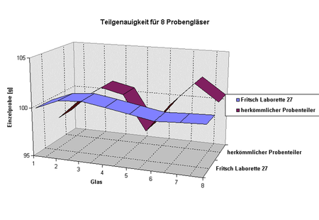 Es wurde eine Mischung aus ca. 800 g Quarzsand hergestellt und geteilt. Bild 1 zeigt einen Vergleich des Fritsch Rotations-Kegelprobenteilers zu einem Rotationsprobenteiler mit dezentraler Aufgabe direkt über den Gläsern. Um gleiche Verhältnisse zu haben, wurde der Teilungskopf für 8 Gläser mit je 500 ml Inhalt verwendet. Die Überprüfung der Gleichverteilung in den Gläsern ergibt, dass die LABORETTE 27 herkömmlichen Probenteilern deutlich überlegen ist.
