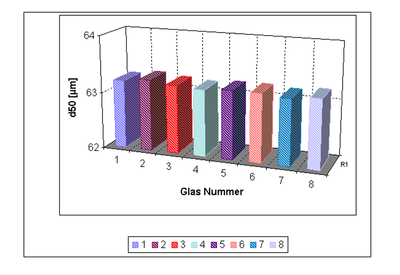 Der Median-Mittelwert der acht Reproduzierbarkeitsmessungen beträgt x = 63.1925 ± 0.012 [μm], während der Median-Mittelwert der einzeln gemessenen Proben in den acht Gläsern x = 63.1975 ± 0.027 [μm] beträgt. Der Vergleich zeigt, dass die Genauigkeit des Analysengerätes natürlich sehr viel höher liegt als die Genauigkeit nach der Probenteilung. Trotzdem ist deutlich zu erkennen, dass der durch die LABORETTE 27 verursachte systematische Fehler sehr gering ist.