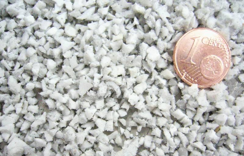 Aufgrund positiver Erfahrungen mit anderen Elastomeren, wurde ein Teil der Probe mit Trockeneis gemischt und unter Verwendung des 4 mm Siebes zerkleinert. Dies war problemlos möglich. Es war zu bemerken, dass der Silikonkautschuk trotz Kühlung elastisch blieb. Die Zerkleinerung ohne Kühlung im zweiten Versuch ging genauso problemlos.