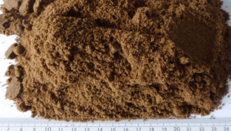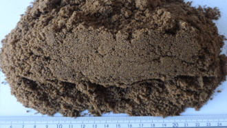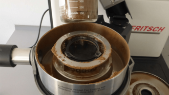Wir stellten die maximale Drehzahl von 18000 U/min ein und verwendeten eine Charge von 200 g Hunde-futter. Die Probe wurde langsam zugeführt und innerhalb von 1:40 Minuten gemahlen. Während des Mahlvorgangs war ein typisches Mahlgeräusch zu hören. Anschließend untersuchten wir die Mahlkammer: Es waren keine Perforationen verstopft, aber es war zu sehen, dass die Probe sehr fettig war und allmählich am Siebträger und am Auffanggefäß anhaftete. Wir verpackten die Probe und reinigten das Zubehör der Rotor-Schnellmühle PULVERISETTE 14 premium line mit einer weichen Bürste und heißem Wasser.