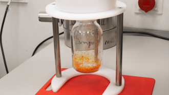 Als nächster Schritt wurden die vorzerkleinerten Stücke in ein geeignetes Gefäß gelegt und mit flüssigem Stickstoff N2 versprödet. Es wurden Siebschalen mit Trapezloch 1 mm im Schneidrotor verwendet. Die zerkleinerte Probe wurde im Auffanggefäß sowie dem Probenglas des Kleinmengenzyklons aufgefangen. Der Kleinmengenzyklon wurde passiv ohne Staubsauger genutzt.