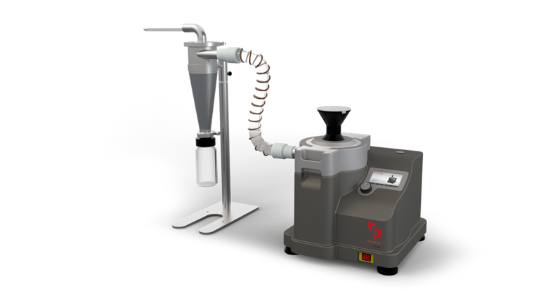 Der Kleinmengenzyklon sollte mit einer Absaugvorrichtung, die Sie gleich mitbestellen können, kombiniert werden. Mit dem mitgelieferten Feinstaubfilter 80 – 100 μm bzw. 35 - 40 µm lässt sich der Kleinmengenzyklon bei trockenen, rieselfähigen Proben in kleinen Mengen bis 200 ml wie Reis oder Maiskörnern und bei der Verwendung mittlerer Siebgrößen auch passiv einsetzen.
