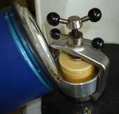 | Bilder: | Aufgespannter Mahlbecher mit Stickstoffhülse zur externen Kühlung des Mahlbechers. |