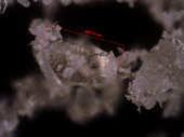 | Mikroskopische Aufnahme der gemahlenen Probe. Unter dem Lichtmikroskop fanden sich noch Partikel bis zu einer Länge von ca. 890 µm. |