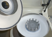 Schlagrotor mit 12 Rippen aus Edelstahl + Siebring 0,25 mm Trapezloch (2. Versuch mit Probenabsaugung mit Zyklon) |