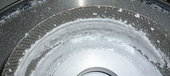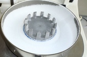 Deckel mit Siebring abgenommen. Schlagrotor und Siebring sind minimal mit Probe behaftet. Eine Zerkleinerung größerer Mengen ist plausibel. Die gemahlene Probe klebt aufgrund ihrer elektrostatischen Aufladung in der Auffang-Pfanne und muss ausgepinselt werden. Mit der Standard-Pfanne sollte eine Mahlung von bis ca. 50 g versprödeter Probe möglich sein. |