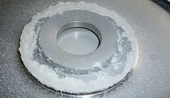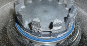Im zweiten Mahlversuch wurde das ebenfalls vorab versprödete Material mit der Standard-Pfanne und einem Siebring mit 0,25 mm Trapezloch gemahlen. Trotz langsamerer Aufgabe der Probe zeigte ein geändertes Mahlgeräusch nach wenigen Stücken, dass Material zwischen Rotor und Siebring zu schmelzen beginnt. Die Mahlung wurde nach ca. 1 Minute und ungefähr 5 g Probenaufgabe unterbrochen. Nur wenig Probe passierte die Trapezlöcher, das meiste Material wurde zwischen Siebring, Deckel und Schlagrotor verschmolzen.