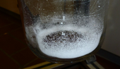 | Im Auffanggefäß des Zyklons finden sich nur sehr wenige gemahlene Körnchen, welche sehr stark elektrostatisch aufgeladen waren und sich nicht auspinseln ließen. |
