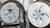 | Bilder: | Geöffnete Mahlkammer nach Abschluss der Versuche – etwas Material haftet aufgrund von elektrostatischer Aufladung im Gehäuse. Solche Rückstände lassen sich recht einfach auspinseln oder aussaugen. |