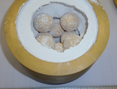 | Bilder: | Geöffneter Mahlbecher nach einer Mahldauer von 2 Minuten – beim Trockenmahlen wird die Glasprobe stark an der Becherwandung des Mahlbechers verdichtet. Eine längere Trockenmahldauer wird nicht empfohlen. |