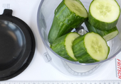 | Bilder: | Um 400 g Probe einzufüllen musste die Gurke auf < 70 mm vorgeschnitten werden. |