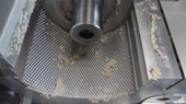 Die vorzerkleinerte Probe aus Ergebnis 01 wurde für diesen Versuch verwendet. Statt der Siebkassette mit 4,0 mm Quadratloch, wurde eine 0,75 mm Trapezloch-perforierte Siebkassette eingeschoben. Die ~ 120 g Probe wurden innerhalb vom 100 Sekunden gleichmäßig schnell in die Mahlkammer gefüllt. Das Mahlgeräusch war typisch und verstummte rasch, nachdem das letzte Fragment zugegeben wurde. Nach 1:50 Minuten wurde die Mühle gestoppt und der Mahlraum inspiziert.