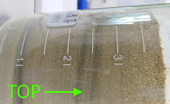 Der Austrag im Auffangglas des Zyklons war wesentlich feiner als in Ergebnis 1. Hier musste die Probe auch wesentlich länger in der Mahlkammer verbleiben. Wir empfehlen nicht, größere Mengen auf diese Weise zu zerkleinern.