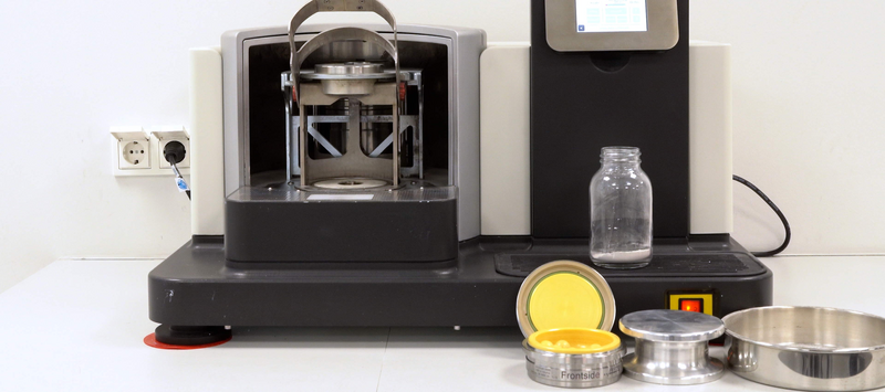 Wir verwendeten einen geringen Teil der Probe, die zuvor mit unserer Universal-Schneidmühle PULVERISETTE 19 L zerkleinert wurde, um diese noch feiner zu mahlen. Die Probe wurde innerhalb von 38 Sekunden aufgegeben und gemahlen. Das Mahlgeräusch war typisch. Mit Hilfe unseres Mini Zyklons wurde die Probe in ein Probenglas überführt.