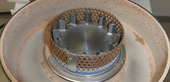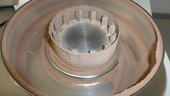 | Bilder: | Geöffnete Mahlkammer, nachdem 20 Gramm der versprödeten Probe gemahlen worden sind. Auch bei diesem Versuch klebt etwas geschmolzene Probe an der Außenseite des verwendeten 1,5 mm Trapezloch-Siebrings. |